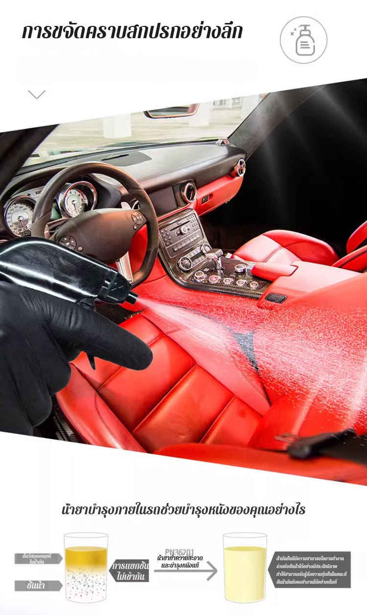 👉 เหมาะสำหรับวัสดุภายในรถยนต์หลากหลายชนิด เช่น หนัง หนังสังเคราะห์ พลาสติก และยาง สูตรเป็นมิตรกับสิ่งแวดล้อม ไม่กัดกร่อน